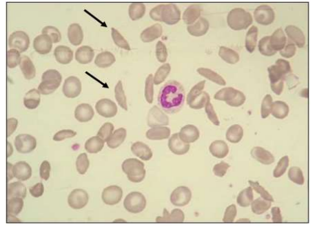 Fonte: ROMANA, Danyelle (2020). Nota: Em um esfregaço sanguíneo nota-se a presença de poiquilocitose nas hemácias, algumas delas em forma de drepanócitos, característica própria da anemia falciforme.