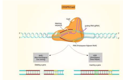 O sistema de nuclease Cas9 (CRISPR)- repetições palindrômicas curtas regularmente espaçadas em cluster, um sistema imunológico bacteriano que pode clivar DNA de bacteriófagos ou plasmídeos, permite o direcionamento programável de inserções ou exclusões (indels) em um local específico do DNA genômico (Bak RO, Dever DP, 2018).