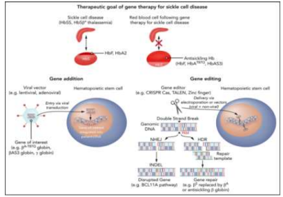 Em outra, como corrigir um gene defeituoso ou reativar um gene protetor (como o da hemoglobina fetal). Essas duas técnicas, são de adição e de edição dos genes. A adição de genes envolve a inserção de um gene de interesse (como um gene de globina) em uma célula-tronco hematopoiética usando um vetor viral. A edição de genes utiliza editores de genes como CRISPR-Cas para criar uma quebra de fita dupla no DNA genômico. A edição pode resultar em um gene interrompido (via NHEJ) ou em um reparo de gene (via HDR), que permite a substituição do gene defeituoso. Ambas as abordagens visam corrigir o defeito genético subjacente que causa a doença falciforme, resultando na produção de hemoglobina “antifalciforme”. Estas células geneticamente modificadas, são então infundidas após a mieloblação com bussulfano (Figura 10).