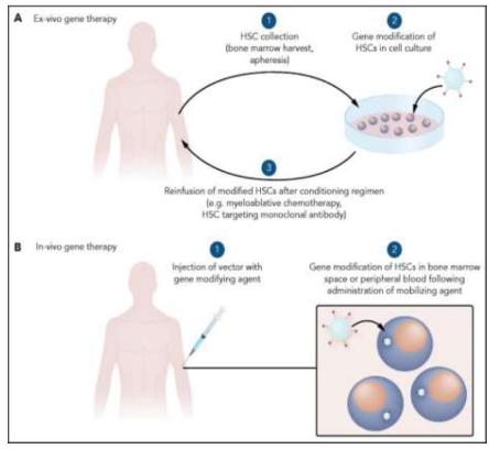 Fonte: Abraham AA (2021). Nota: explanação de uma terapia ex vivo e in vivo. A primeira seria a correção com a remoção das células do paciente, correção em laboratório, e devolução ao corpo. A segunda, seria a correção pela injeção do tratamento no corpo do paciente.