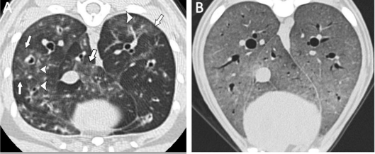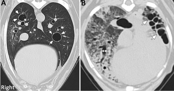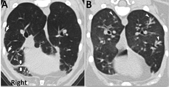 Figura 3: (A) gato com distúrbio bronquiolar primário, com espessamento intersticial subpleural (setas de cabeça grande), linha de fissura pleural espessada (setas grossas) e vias aéreas de pequeno calibre espessadas e dilatadas, sugestivo de broquiolectasia (setas pequenas). (B) padrão de árvore em botão, pequenas vias aéreas preenchidas com atenuação de tecido mole ou fluido, sugestivo de distúrbios bronquiolares.