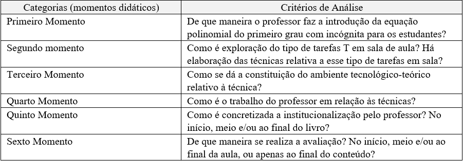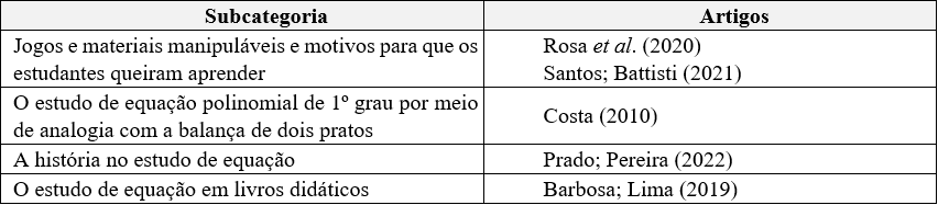 Assim, nessa subcategoria foi considerada uma pesquisa realizada por Barbosa e Lima (2019). Os referidos autores realizaram uma análise comparativa entre as praxeologias presentes em livros didáticos e as práticas efetivamente empregadas pelos professores no ensino de equações polinomiais do primeiro grau. A investigação teve como objetivo identificar a relação entre materiais didáticos, no caso livros didáticos, e estratégias usadas pelos professores.