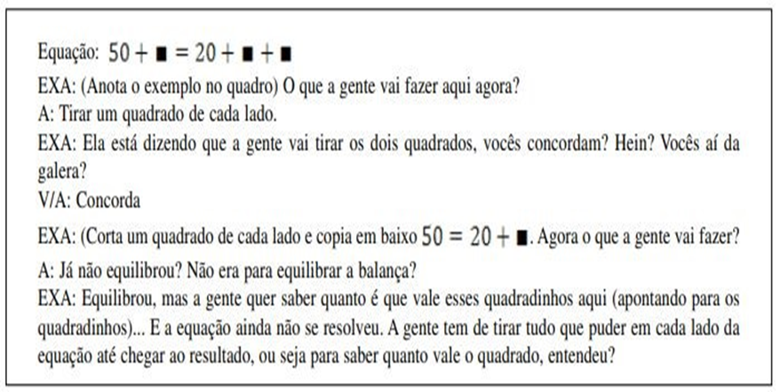 Costa (2010) pontua sobre a necessidade em insistir na compreensão da estratégia, mesmo quando os estudantes já tiverem obtido a resposta. Assim sendo, é preciso reforçar as estratégias e procedimentos considerados na resolução da equação para encontrar o valor da incógnita e, dessa forma, os estudantes concluírem a situação apresentada. De forma geral, a interação estabelece a importância de encontrar os valores das incógnitas na resolução dos exercícios e enfatizar a estratégia de remoção de termos com uma abordagem apropriada para atingir o objetivo.
