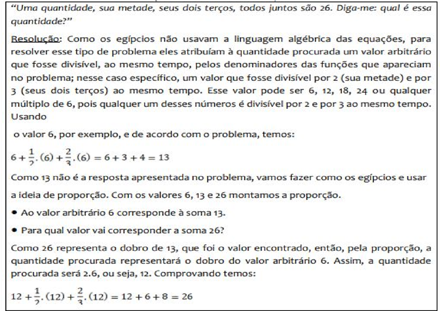 A finalidade de mostrar aos estudantes esse método é aplicar uma das potencialidades citada anteriormente para a HM, ou seja, comparar o antigo com o novo e perceber que os métodos utilizados nos dias de hoje são mais simples que os já utilizados em outras épocas. Permite-se aos estudantes, desse modo, além de conhecer outras formas de solucionar o mesmo problema, também perceber que a evolução dos conteúdos ocorreu para tornar seu processo de resolução mais simples. Para finalizar esse momento, mas também como forma de possibilitar-lhes chegarem à conclusão desejada sobre a comparação entre os métodos de resolução, solicitou-se que os estudantes resolvessem o mesmo problema que foi exposto anteriormente pelo Método da Falsa Posição, aplicando agora o processo com o qual eles já estavam acostumados a resolver Equações Polinomiais do 1º grau, ou seja, o princípio aditivo e multiplicativo. Ao final, eles consumaram que os antigos egípcios realizavam uma movimentação muito mais complexa e demorada para chegar à solução dos seus problemas e que a evolução da Álgebra, especificamente das equações, possibilitou a descoberta de maneiras com menos processos para se chegar ao resultado para esse tipo de situação.