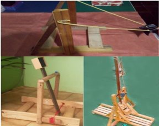 Durante da socialização dos trabalhos, no contexto da sala de aula, Santos e Battisti (2021) perceberam que os estudantes tiveram construções distintas um dos outros. Foram apresentadas uma variedade de catapultas construídas, incluindo: a balista, o mangonel e o trebuchet. A maioria dos estudantes compartilhou que investiu tempo em pesquisas para selecionar a catapulta mais interessante ou mais fácil de construir. A Figura 7 mostra algumas das catapultas construídas pelos estudantes.