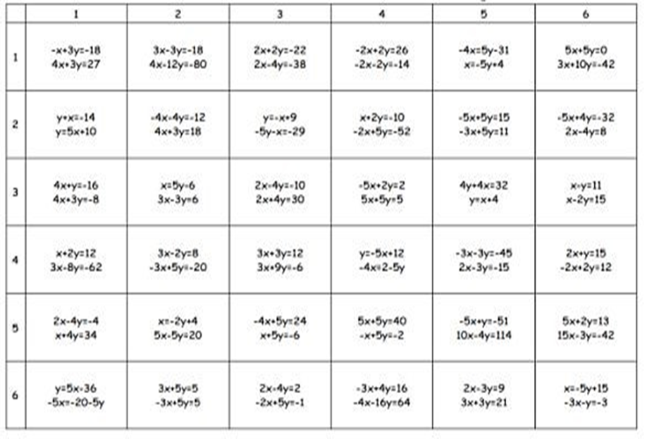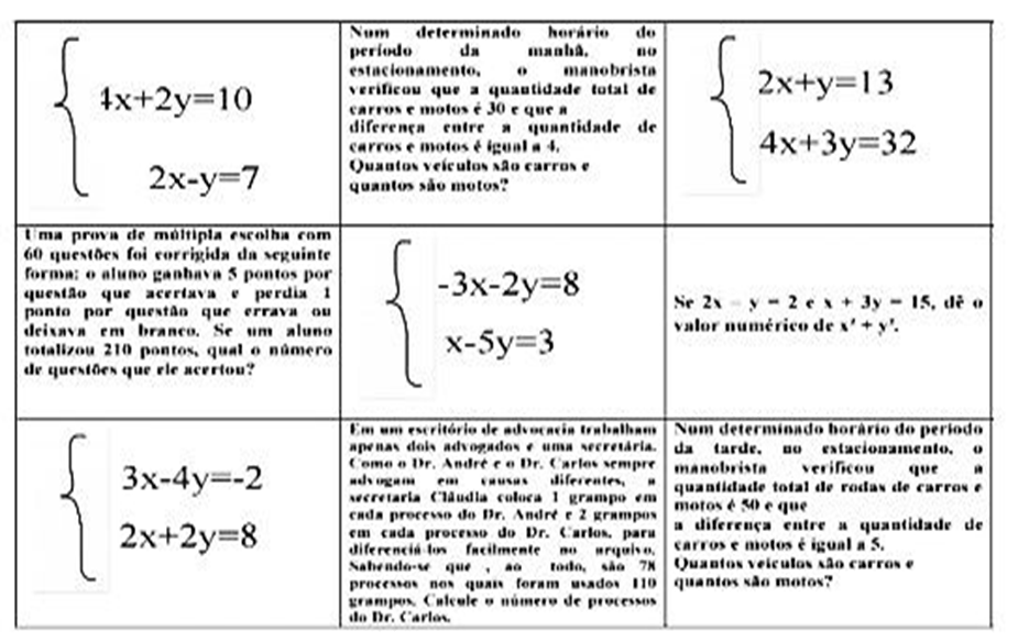 Os estudantes foram orientados a formar duplas e receberam esses tabuleiros para jogar. Cada estudante tinha sua vez de escolher um dos quadros e resolver o sistema nele apresentado. Se acertassem, pontuavam; caso errassem, não pontuavam. A partida seguia as regras tradicionais do jogo da velha, com a ressalva de que, em caso de empate, uma questão adicional era apresentada para determinar o vencedor. O ganhador seria aquele que respondesse primeiro e de forma correta. Se o primeiro a responder errasse, o oponente saía vitorioso (Rosa et al., 2020).