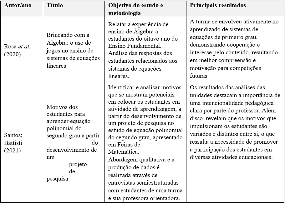 Esta subseção se constitui a partir de discussões e sínteses que consideram as pesquisas de Rosa et al. (2020) e Santos; Battisti (2021). Os autores Rosa et al., (2020) descrevem em seu estudo uma experiência de ensino de sistemas de equações lineares com o uso de jogos, destacando a motivação dos estudantes e o envolvimento ativo no aprendizado. Já Santos e Battisti (2021), avaliam os motivos dos estudantes para aprender equações polinomiais do segundo grau por meio de projetos de pesquisa, revelando a importância dos motivos que levam os estudantes a quererem aprender como aspecto relevante para a aprendizagem.