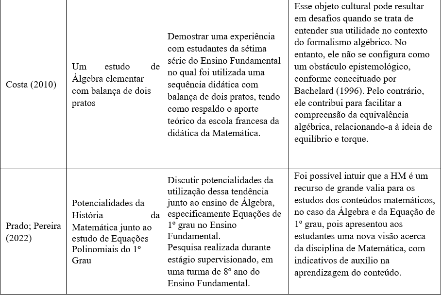 Os estudos analisados abordaram diversas facetas do ensino e da aprendizagem da Álgebra, explorando sobre a análise do uso de recursos didático pedagógicos no ensino de equação. As pesquisas complementam a discussão sobre o ensino da Álgebra e contribuem para o campo da Educação Matemática, promovendo uma compreensão mais abrangente sobre possibilidades de qualificar os processos de ensino e, assim, de aprendizagem da Álgebra.