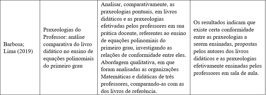 O estudo de Barbosa e Lima (2019) faz parte de uma pesquisa de doutorado que abordou questões relacionadas ao ensino da Álgebra nas escolas. O principal objetivo da pesquisa foi a reconstrução de elementos matemáticos específicos, como tipos de tarefas, técnicas, tecnologias e teorias, juntamente com materiais didáticos, como os momentos de estudo, para o ensino de equações polinomiais do primeiro grau. Para atingir esse propósito, os autores examinaram as estruturas Matemáticas delineadas em três livros didáticos destinados ao 7º ano do Ensino Fundamental e estabeleceram comparação com as práticas pedagógicas aplicadas por três professores em sala de aula, à luz da Teoria Antropológica do Didático (TAD)4 proposta por Chevallard.