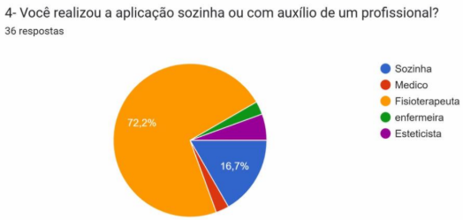 Um dado que causa preocupação é o fato de (16,7%) do público alvo realizar a auto aplicação, infelizmente não existe nenhuma norma regulamentadora para aplicação por profissional da saúde ou ainda que impeça que isso aconteça associado a livre demanda em sites e revendas físicas, podem trazer prejuízos ao resultado esperado com a aplicação da técnica, além de danos colaterais como queimaduras, que são causadas quando se tem uma aplicação feita de forma inadequada colocando tensões exageradas na fita de taping quando em contato com a pele.