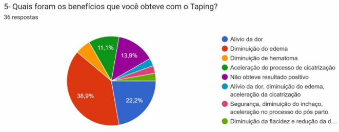 6% dos participantes alegam não terem efeitos positivos com o uso da técnica, aqui também encontra-se a necessidade de expandir futuras pesquisas para se entender os motivos, se isso aconteceu devido a aplicação incorreta da técnica, qualidade da fita aplicada ou ainda por algum infortúnio ocorrido durante o uso do taping. Ademais, a heterogeneidade das respostas também indica a necessidade de individualização do uso da técnica, respeitando as características clínicas e as necessidades específicas de cada paciente.