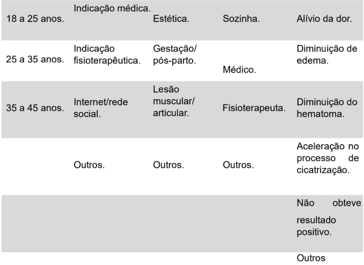 Acatando o questionário, 36 respostas foram selecionadas de acordo com os critérios do fluxograma 2 deste artigo. Em primeiro lugar evidenciamos que a idade predominante está entre e anos, e que apenas (13,9%) dos entrevistados não obtiveram efeitos positivos com o uso da técnica. Enquanto que, o alívio da dor foi referido em (22,2%) das respostas acompanhado por redução do edema (38,9%). Reconhecendo acelerar o processo de cicatrização somam (11,1%), e ainda outros 14% relatam outros tipos de benefícios.