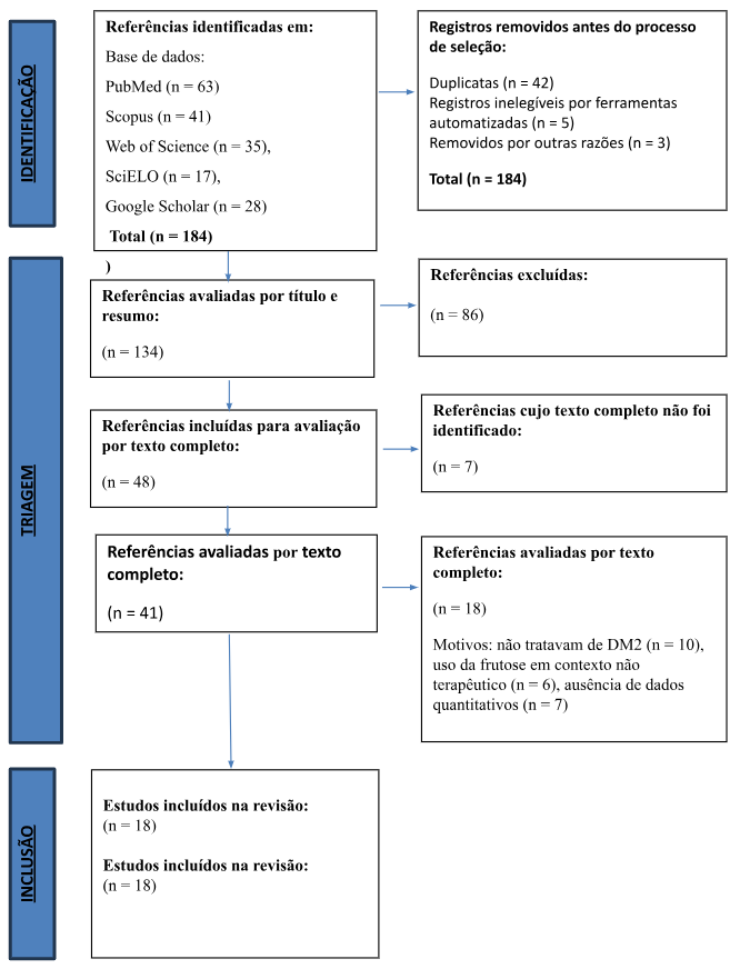 Foram adotados os seguintes critérios de inclusão: artigos publicados entre os anos de 2000 e 2024, disponíveis em português, inglês ou espanhol, contendo estudos clínicos, experimentais ou revisões sistemáticas que abordassem o uso ou o metabolismo da frutose em populações humanas com diabetes tipo 2 ou em modelos animais com indução experimental da doença. Foram excluídos artigos duplicados, textos sem acesso completo, trabalhos irrelevantes ao tema, além de cartas ao editor, notas técnicas, dissertações, teses e artigos de opinião.