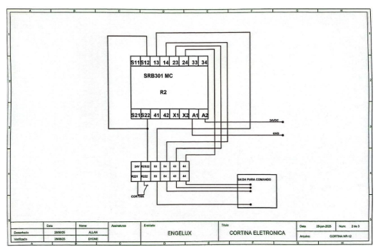Com a impossibilidade de fechamento total na parte frontal da máquina, foi sugerido a instalação de uma cortina eletrônica para passagem apenas dos cabos, com isso instalamos uma cortina eletrônica com um contato normal aberto composto de um par de cabos branco e preto que estão conectados aos bornes S21 e S11 para ativar o rele 301 que terá os bornes X1 e X2 jampeados para que seja resetado quando a cortina  não estiver livre de obstáculos, ativando assim os contatos auxiliares liberando a máquina de  cola para operar normalmente.
