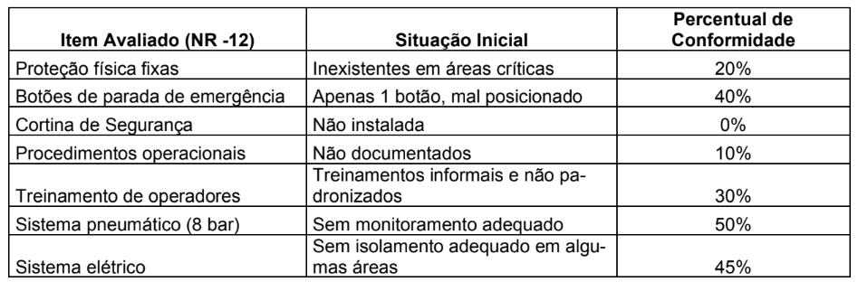 Etapa 2 – Observação do ambiente – Esta análise permitirá verificar o uso de dispositivos de  segurança existentes, tais como proteções físicas, cortinas eletrônicas, botoeiras de emergência  e chaves de intertravamento. Paralelamente, serão identificadas práticas inseguras ou eventuais  não conformidades com os requisitos da NR-12.
